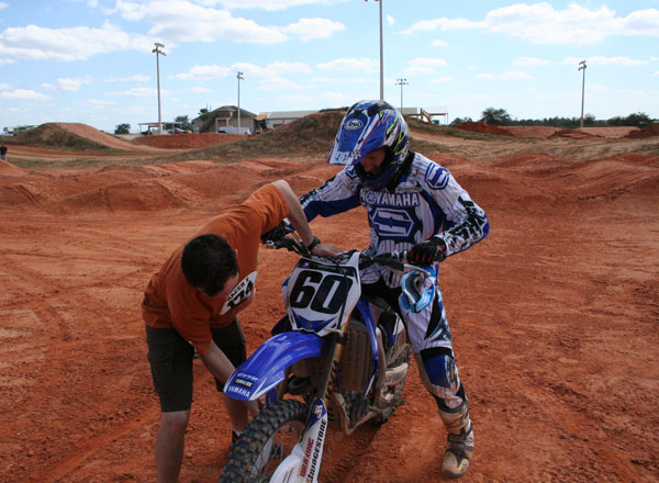 | Eventually Ursic got tired of watching Weege help out his buddy and favorite rider so he pushed Weege aside and got busy helping Broc. This weekend, if Hepler pulls the holeshot Weege and Billy will break their arms slapping each other on the back. |