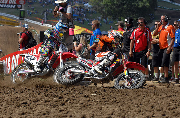 | This is about as far as these two got from each other in the first moto. It was ballsy of Ryan Dungey to get in there and battle Christophe Pourcel. You just never know what could happen, a simple fall and a broken clutch lever or something dumb like that and the championship looks different. Pourcel said that he was slowing down in hopes of getting a teammate in there but that never happened. I applaud Dungey for getting in there and showing his rival that he wasn’t afraid to mix it up. |