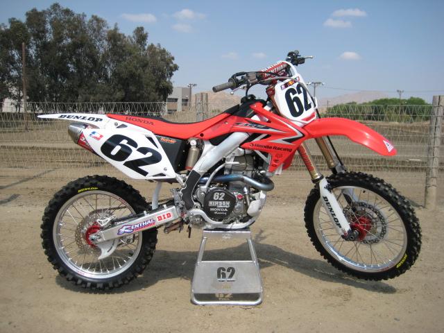| I saved the best for last, this is his cool CRF. Looks just like a factory bike! Check out the custom clutch cover and red hubs and the tire stickers. Ruben’s connected somehow. |