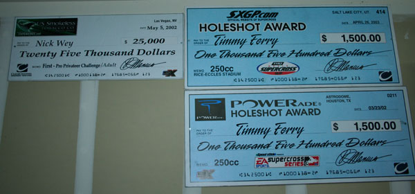| First of all, yes I should’ve painted my garage when I moved in. Too late now. Here are some checks that, unfortunately, are fake. A couple of holeshot awards for Ferry and the top privateer check for Wey from the awards banquet. I tried to take these things to the big check department at my bank but no luck. |