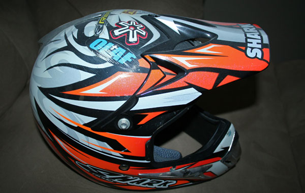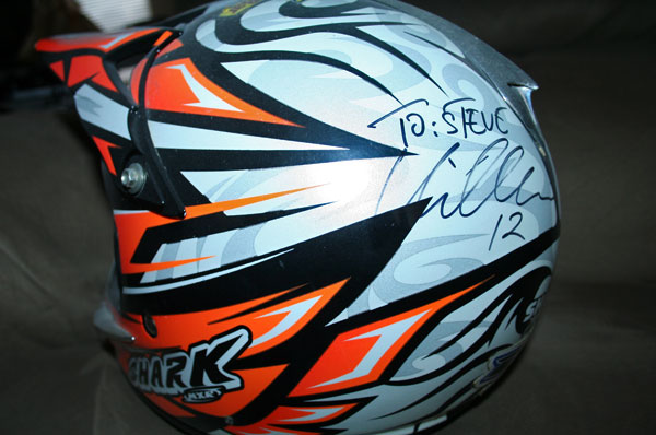 | I showed you guys Reed’s helmet last time, here’s one of DV’s. It’s an older helmet that he crashed on (as you can see) and I remember I asked David for a helmet sometime and not really thinking that he would remember or care but he went to his locker upstairs and came down with this. He signed it and everything! That DV, good guy. |