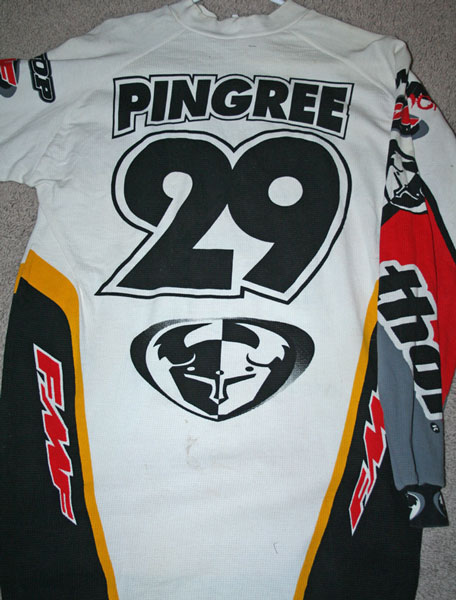 | This is an actual jersey of The Rollerball. I traded a signed James Stewart jersey for this off some guy named Cal I used to race against. I think that Cal might have taken me as this thing is real small and Roller was a big man. I’m kidding…kind of. Anyways, if it really is THE Ross’s, then I am honored as it has his dirty neck sweat on it. |