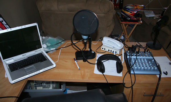 | Here’s where the magic happens people! My podcast set-up in the den upstairs. I bought a desk when me moved in but found that I didn’t really ever sit in it and work much so I moved the podcast stuff out of the spare room and out here so that I used the desk a bit more. The only problem is the dogs come up and bark once in a while but I like to think that adds to the amateur hour feel. This is where we’ll be doing the Motoworldracing.com Moto Show from. |