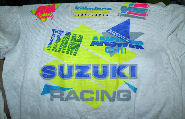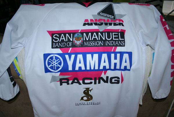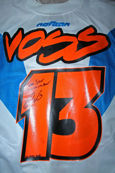 | When Ferry was injured I had some time on my hands and was now the test guy. Heath Voss was riding a full-factory bike for Mach 1 and having a hell of a time with the carboration of it. So myself and Bob Oliver went out with him for three or four days to try and figure out why it would hesitate under load up the face of jumps. We tried just about everything we could think of (floats, needles, carbs etc, etc) and fixed it for him finally. As a show of appreciation, Voss gave me this jersey that says "To Steve, thanks for your help with the beast." |