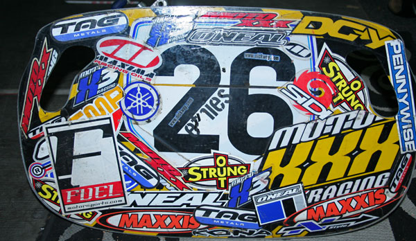 | This is my pit-board that I used all year at Moto XXX in 2002 when I worked for Nick Wey. It started the season out as a Mechanix Wear board but we just kept adding stickers. Then it became the "XXX Crazy Board" and took on a life of it’s own. The other side is so black from marker residue that Nick probably couldn’t see anything but there was no way that we could get a new one. This thing saw the entire sx and mx season. This is actually one of my favorite things just because…well I don’t really know. |