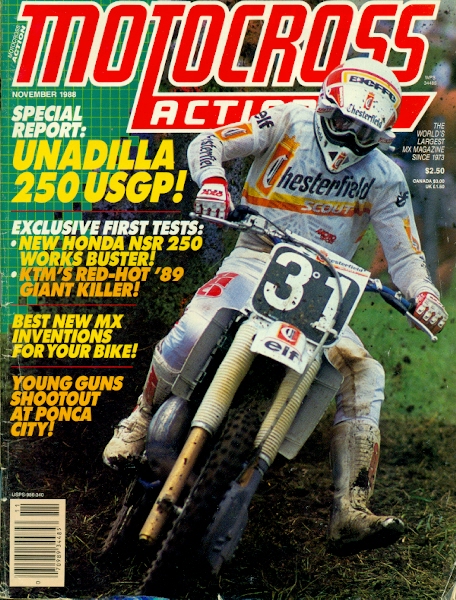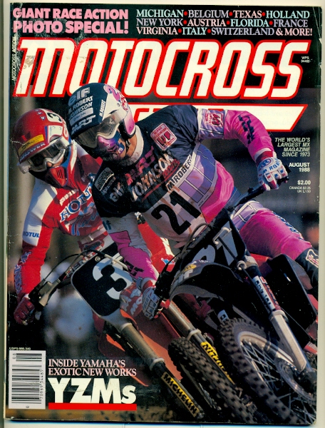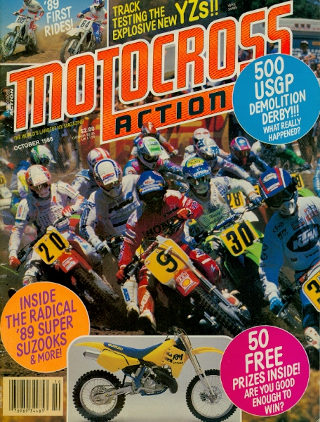 Another month of MXA, another Euro on the cover! This time it’s a start shot of the 500 USGP. Front and center is Eric Geboers and to his right is the UK’s Mark Banks. The inset shot is the new ’89 RM 250 and I always loved the way this bike looked. Geboers would actually go on to win this race and it’s funny because from ’82 on, you just assume that Americans won every USGP there was to win but that’s not true. Geboers won this one, I believe Demaria won at Budds Creek and Van Der Ven might have won one in there someone. To me, these dudes deserve a tip of the hat. The ‘Dirt’ section has a report from the Binghamton 125/500 where they spell Binghamton wrong! They add the ‘p’ in there at the end and it’s a common mistake. I’ve done it a few times here and there, actually come to think of it, maybe I shouldn’t comment on other people’s spelling as I’m still trying to grasp that part of writing. Anyways, Guy Cooper wins the 125 class again and since he’s come back from his broken leg he’s been the man-winning four races on the season which is double anyone else in the class. Too bad for about that broken leg that he suffered at an off-season supercross. Here are the results from the 1988 Binghamton national. 125 1-Guy Cooper 1-2 500 1-Rick Johnson 1-1 There’s a report from Luc Verbeke (a Euro) on the 500 Euro guys and how they couldn’t clear a tabletop at the recent USGP that American intermediate riders would’ve cleared. He does mention that Geboers eventually jumped it but that the 500 guys looked “spodey” when they couldn’t clear it. He then mentions that there was a set of four jumps that were about ten feet apart and the American guys were clearing them but that David Thorpe and Jacky Vimond protested and got them flattened because they were classified as doubles, which was a no-no with the FIM at that time. So the author says that, just like America, the 250 class is where it’s at in Europe and this feature is about the best in that class. Rodney Smith is one of the best along with Dutchman Jon Van De Berk. Rob Herring (who always looked the part of a fast guy) and Ricky Ryan are struggling as is two-time 250 World Champion Heinz Kinigadner. An in-depth report from Red Bud on the opening round of the 125/500 series sees Jeff Ward capture the overall via his 1-3 score. The story says that Wardy is on a quest to become the first rider to win every major championship in America. He would have to wait another year though as RJ captured the ’88 title. It’s funny because the Yamaha factory team of Broc Glover and Micky Dymond were not allowed to race the 500 nationals because Yamaha didn’t feel their bike was competitive but Yamaha support rider Jeff Stanton could race. The funnier thing is Jeff is consistently the third best rider showing that the bike is somewhat competitive (one of the funnier moments in the Racer X Podcasts was Bradshaw telling me that he told Yamaha to take the shock off and replace it with a solid strut because at least then would know what the shock was doing. Another time Bob Oliver telling me that the old YZ490’s would start the moto with 65HP and end it at 30. The YZ490-when bad bikes happen to good people!) and even funnier to me was that Stanton was number 8 in the country this year while Glover was 44 and Dymond was 23! The Yamaha crew would be real sorry the next year when Jeff switched to Honda and kicked everyone’s ass for 6 years. A ride report with the ’89 YZ’s shows us that they did have upside-down forks so my question earlier in this story about the bikes is moot. Maybe I’m getting the Yamaha’s mixed up with the Kawi’s? Anyways, the Wrecking Crew liked the bikes and seemed to appreciate the opportunity to be the first to ride them. I don’t think any of the riders in the story are Jody but the one bike does have the familiar #192 on it. Starting from Ed Schiedler and going onto the present guy in charge of Yamaha R&D, MXA has always had a cozy relationship with Yamaha guys. Now Tim Olson, a long-time editor at MXA, is a the PR guy over there. When I worked on the factory team I would venture over to the R&D department and chat it up with the guys over there and they could always count on a friendly MXA review. But Yamaha did make some great bikes in that time as well. Mammoth Mountain race report has Johnny O winning the 125’s on his PC Suzuki 125. There would be no way that O’Mara could win at the high altitude of Mammoth without some kind of major motor work or possibly a 250 motor wedged into that frame. Good for Johnny as his Suzuki years weren’t full of highlights by any means. He beats some legit top 125 riders like George Holland, Mike Kiedrowski and Mike Craig. Johnson wins the 250 and 500’s. For some reason, Mammoth isn’t as big of a deal as it once was with the magazines. It used to be a pretty big race back in the day. I’ve never been and it’s a regret I have, no doubt about it. The 500 USGP from Hollister almost never happened. You know who the promoter was that backed out when the sponsorship dollars weren’t great enough? Pace SRO, the supercross promoters! Who knew that they were in the motocross business back then? Some company named Horizon Enterprises stepped up and the race was saved. As stated above, Geboers won with a 3-2. David Thorpe won the first moto and Jeff Leisk won the second one. Wardy and Lechien crashed in the first turn of the first moto and both pulled out and went home early. A shame because Wardy was over two seconds faster in practice with Lechien second. It sounds like Glover was one of the fastest guys there but crashes late in the motos hurt him and he could only go 9-3 on the day. A real cool story is ‘A year with the ’88 mxers’ where MXA revisits each bike a year down the road once they have lived with them. Every Honda model gets high ratings while the Suzuki 125 gets one star (even more amazing that O’Show kicked every