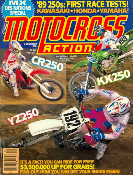December ’88 has three of the 1989 bikes on the cover. The CR, KX and YZ 250 get wrung out by the crew. The new bike tests were always so cool for us in Canada because the ground was under snow and the dealers didn’t get the things until January or so. Oftentimes, we would have months to read the test over and over on the bike we’re going to ride in three months. You would just grease the linkage over and over while the bike sat in your garage. Right out of the hop, there’s a naked picture of Rick Johnson! It’s the famous ‘thinker’ pose with RJ wearing nothing but a pair of Comp-2 boots. Good God, his thighs are ginormous. In The Dirt section, there’s a bit about Yamaha pulling out of the 500GP class because they believe that the 250 class is where the action is. MXA makes a good point by saying that yes, the 250 class is where the action and sales are for Yamaha because they don’t make a viable 500. So there goes the mighty works YZM500 that never saw the light of day in a production version. A test of the ’89 CR250 and MXA seems to kind of like the bike. They love the motor but agree with me that the suspension and handling need work. They don’t seem to think the suspension is that bad but like I said, my buddy had one and it was horrible. At least that’s what I remember. The motor was pretty good, I had a 1990 and I liked it- although the suspension didn’t work that well either. A national wrap-up profiles George Holland and him finally getting his long awaited 125 title while RJ won the 500’s. There’s a shot of Doug Dubach that says his privateer rides earned him a Honda support ride for ’89 which we now know never happened for some reason. Yamaha, Shoei and O’Neal have just always been there for the Doctor. Test on the ’89 KX250 which is basically the same bike as the ’88 which is fine because the ’88 was great. Wait, now that I read the test it seems the bike has new brakes, new revalving in the shock, new gas tank and seat and a 19-inch rear wheel. Ok, so I was wrong. They end the test by saying that “this is the best 250 on the track.” I guess I can skip the issue with the 250 shoot-out. MXA names their sx and mx rookies of the year and they are: SX- Jeff Matiasevich There’s a Yamaha DT-50 test (?!?) where MXA says that they “are happy that bikes like this exist” and that “long live the play bike.” MXA always seemed to bust out some weird stories like this here and there. 1989 YZ250 gives “value to a dollar and fits to the competition.” But you’re saying that it’s not as good as the Kawi… A Loretta Lynn’s Amateur national story written by some guy named Davey Coombs follows the test and we see a starting line shot of the PW50 class. There are a couple of kids named Nicolas Wey and Clint Bowyer pictured as they wait for the gate to drop. I bet this is the first time that Clint Bowyer ever got into a magazine but it certainly wouldn’t be the last. Remember the John Kitsch story from above? Well, he’s the big winner at this race along with Denny Stephenson. Bradshaw, Swink and Antunez are other winners along with Mark Barnett who came out of retirement to race the vet class. Of course, the Bomber smoked them. For some reason, the 1988 MXDN story is buried last in this mag and didn’t make the cover blurbs either. Strange. Anyways, this is the race that Ron Lechien smoked them all. The story says that he led 26 out 30 total laps. The other story, especially because this race was in France, is JMB beating everyone but Ronnie in one moto. On a 125! It was basically Johnny O part 2. In the process of smoking everyone, Lechien was rewarded with a new contract from Kawasaki for the 1989 season which seems about right for Ronnie and his career. Lechien told me that he went out all night before this race and just got back to the hotel before the guys were heading out for practice. Classic. |