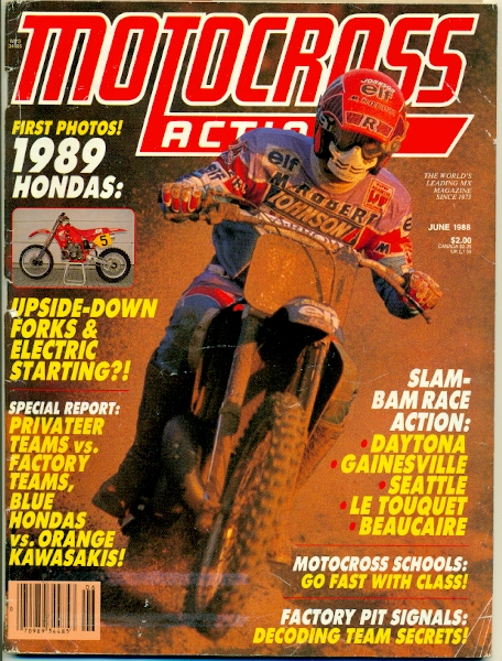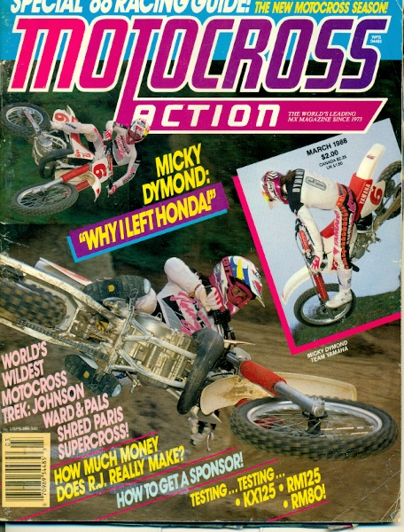 The coverboy on the March issue was Yamaha’s newest signing, Micky Dymond. It had to feel good for Yamaha to poach an emerging star from Honda (even though the red guys didn’t want him) after watching Hannah, RJ and Lechien go to Honda and kill it. The pattern would repeat with Jeff Stanton shortly after this and we now know that this switch to white didn’t work out for Dymond. His lack of results were definitely offset (at least to me) by his unbelievable cool look. The Mick had the riding style, the hair hanging out the back and the pink, white and black Answer gear was pretty much the coolest thing ever. His numbers looked awesome and his mechanic at the time, Ron Heben, once told me that he spent a lot of time making those trick 6’s every week. He said he still has the template in his garage! Dymond started off the season strong with a third in the non-AMA race but got hurt after that and started losing interest in becoming a pro motocrosser. In the podcast I did with him, Micky really seemed to be full of regret that he didn’t try harder. He was definitely one of guys, like Brian Swink, that you look at years later and wonder why they weren’t superstars. The ‘Dirt’ section has a report on the Bercy supercross. There’s a picture of RJ shaking the hand of an 18-year old JMB. Bayle just has on the open face with goggles. Got to love that and I forgot to ask O’Mara on the podcast how in the hell he rode a national like that. Then it’s a feature story on Bercy written by Zap and it’s a good one. Think of it like an “Observations” column from Paris. Not so much heavy text about the actual race but nice little tidbits here and there and Espinoza tries to capture the riders like regular guys and gives you reports on what they did together during the day. The story goes on to relate that JMB does not want to be compared to legendary Frenchman Jacky Vimond. Bayle says that Vimond is the true French hero, not him. A few years after this, people would be saying “Jacky who?” as JMB wrecked havoc on the world racing scene. 1988 RM 125 test ends with “Is it a winner? It is in the right hands.” Which is code for “This thing sucks but if your name is Rick Johnson, you could probably win on it.” There’s a World Supercross Series that was going on but one of the rounds included the infamous Veronica Beach race. Suffice to say, RJ, Wardy and the Dogger weren’t lining up for the wide open in sixth gear, down a whooped out beach race. Eric Geboers won and it allowed him to slip into the lead of the WSX series. That’s fine, I’m sure RJ was like “Have at it.” An interesting story is on how much money RJ makes in a year. It says that Johnson’s Honda contract is worth $275,000, his Oakley deal is $20,000 and his Fox deal is $100,000. I’m not sure how accurate those numbers are but, after the win bonuses are all added up, it says that RJ made over a million bucks in 1987. In 2002, Broc Sellards was getting $275,000 from KTM to ride half the supercross series and the nationals. MC told me on the podcast that his best year in salary from an OEM was around $350,000 so that seems about right if you jump from RJ to MC but then after that, things got a little loopy in the rider salary department. At the back of the magazine, in the new products section, there is an ad for the Donnie Hansen Motocross Academy and shows Donnie blasting a turn. That’s cool and all but he’s got a big number 0 on his bike. Why would you put number zero on your bike and then try to sell yourself as a teacher? Weird right?