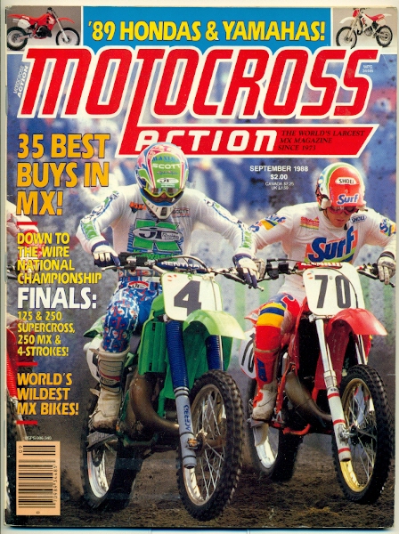 Ahhh, the September issue. I can remember this cover like it was yesterday. The Dogger in all his glory with the set of gear that probably remains my favorite to this day. I had the same look going on while I fought tooth and nail for Manitoba 80cc title. I also loved this helmet that Ronnie’s wearing and Jeff Glass gets his only MXA cover with his cool Surf Detergent look. I love the two-page feature on the all of the top riders helmets. I’m going to scan this in and put in up on the site. One of the biggest regrets that I have about today’s riders is the lack of helmet “coolness.” Out of the sixteen helmets shown, I’d have to say that Glovers and Lechien’s JT ALS-2’s look the coolest. Ol’Wardy still ran the open face and was probably the last guy to give it up. A 125 SX wrap-up shows us that the top ten in each coast was: WEST 1-Jeff Matiasevich EAST 1-Todd Dehoop There’s a questionnaire about what’s wrong with the 125 supercross class. Mitch Payton says that they should get the east and west coasts together and shoot them out at the end of the year. He’s a smart man. Goat Breker won the World Four-Stoke Championship with Ed Arnet and Gary Jones following close behind. Clearly with the original GOAT racing this event, his GP career is over. A supercross wrap up that tells us RJ reclaimed his indoor crown and I find it interesting that, with the sx promoter wars going on, the actual championship was only nine rounds (only eight cities with Seattle being a doubleheader). Ward raced seven of them, won 1, finished third in 1 and got second at the other 5. RJ won 7 out of the 9 with Ward winning 1 along with Glover getting the last round at LA. Parity thy not know the 1988 AMA Supercross series. Trouble-shooting the ’88 CR125 and nowhere in the entire article can I find the words, “sell it and buy an ’87” which is what people should’ve done. The only problem with that is the color difference between the two and if you had an ’87, you were mocked as being out of date. An expose on the 1989 Hondas shows us that entire line received the low-boy pipe and styling of the ’88 CR250. Well, except for the 80. While these photos got most of us drooling at the usual Honda trickness, what no one knew was that, underneath that shiny look, lay the worst suspended machines ever. Honda went to the upside-down forks and the bikes were horrible. My buddy had a CR250 and I could barely ride it. It felt like Romans were driving stakes through my palms every bump I hit. There’s a similar story on the ’89 Yamahas and what’s weird about this is that the bikes in the photos have upside-down forks. Well, we never got them in Canada. Something happened at the final stages and Europe and Canada received the old forks. I’m not sure about the USA models, I think they didn’t get upside-downs either. Leave me a comment if you know. They did have a 19-inch rear wheel which was super cool at the time. |