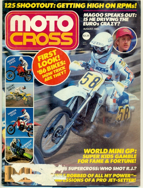 An ’85 125 shootout and a cover shot of Magoo is on the August ’85 cover. Magoo didn’t do much in the 500 GP’s but he did win a GP at one point. Remember when he was going to first ride for Kawasaki’s but then was told that he had to pull over for Jobe? He declared this unacceptable and switched over to KTM. Nice Lazer helmet Danny. Chandler’s 1982 MXDN ride is top five in the greatest races ever in my mind, maybe even top one. |