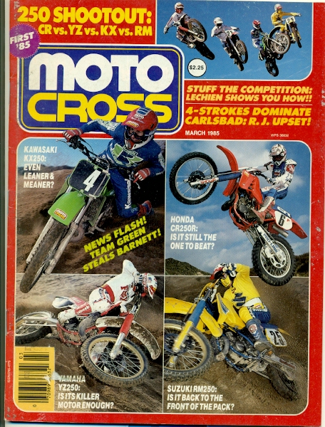 | Team Green did not steal Mark Barnett as this cover claims. I’m sure they were looking for a headline but when I did a podcast with Mark, he said that Suzuki never offered him another deal after ’84. The 250 shoot-out is in here and it’s a foregone conclusion that Honda is going to win. The Yamaha was pretty good this year though. |