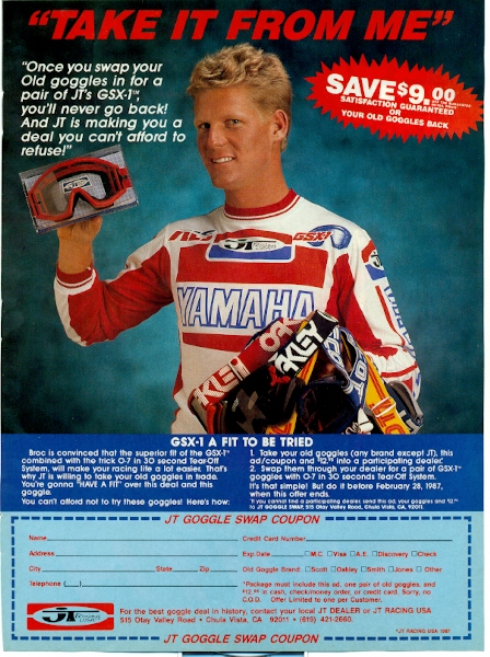 This was pretty cool, you sent your old goggles in and for $13 bucks, you got a brand new pair of JT GSX-1 goggles. Pretty sweet promotion and JT threw enough money at Glover that he left long-time sponsor Scott for them. Recently I was thumbing through this magazine under the Kawi truck when, lo and behold, The Golden Boy came by. I showed him this ad, asked him how much JT paid him to run the GSX-1’s (which by the way, were pretty sweet goggles) and he shook his head, laughed and said "Why do you guys all care about this old stuff" and then walked away. He probably went to Wey’s pits and upon seeing Nick had to stand there and listen to Wey do the whole "Winner’s Take All" scene that Broc was in. |