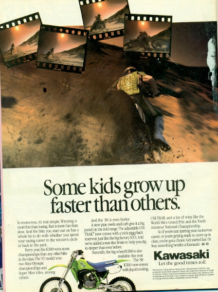 I was so bummed when this ad came out because I had this bike and I can tell you that the bike looked one million times better from the other side! Why they would run this look is beyond me. Also, in Canada the side panels were green, not blue. This bike was bad-ass, it had a rear disc and was prettyt fast. My dad bought a 105cc kit for my practice bike and I couldn’t keep the front end down. Anyways, I ended up losing the provincial 80cc Expert title by, like, 2 points or something. Heartbreak I know. |
