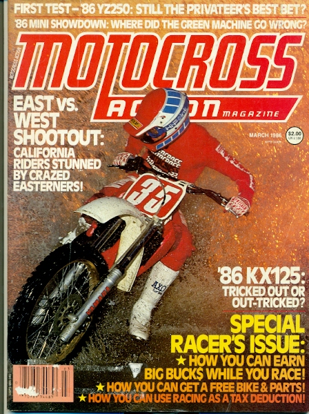 This is a cool cover with Larry Brooks wringing the 86 YZ250 on the beach somewhere. A real cool shot for sure. I’ll have to ask LB where that was and the details behind it sometime. Anyways in 85 the YZ250 was really good but in 86, they changed the motor and took a step backwards. At least according to MXA. Weird deal, they improved the 125 mucho but hurt the 250. Anyways, with some motor mods, they think it can still be a pretty good bike. There’s a bunch of mumbo-jumbo about contingency and how to make money at racing and get sponsored. It’s full of charts and pay-outs and crap. Jody must have been camping with Lovely Louella this month and mailed this one in. There’s an 80cc shootout between the KX and YZ and really, it’s not a fair fight. Yamaha hadn’t changed its motor or suspension in three years while Kawi always made a pretty good mini-bike. In fact, a 1984 KX 80 was probably still better than the 86 YZ. They do say that the YZ is good for beginner riders so I suppose that’s something. A test on the new KX125 and I actually had one of these bikes. The gang says the motor’s good but that’s about it. They fail to mention the plastic breaking if you looked at it cross-eyed, the bolts stripping, the rear disc being a light switch and the general crappy state that the bike would fall into after a dozen rides. Remember the Rodil Cup from last month? Well the mag details the 125 East/West shootout from that same race in this issue. This was before the Dave Coombs Memorial Race that we all know today. The East’s Rodney Barr (of Barr’s Competition fame) won the three moto format race (and another east rider, Eddie Warren took second) but the west guys filled out the next eight spots so we didn’t really prove anything did we? |