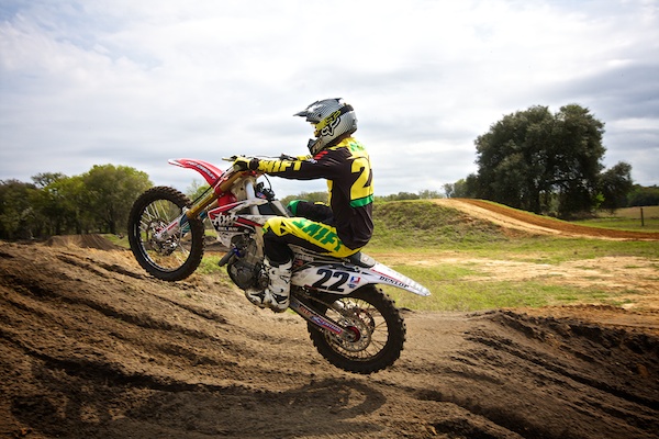 The Bomber attacks! 3-time 125 national champion and supercross champion Mark Barnett, there to work on the track for Reed, took time to saddle up and test out his creation. He’s on Reedy’s ’08 CRF450 and yes, he still rides pretty good. |