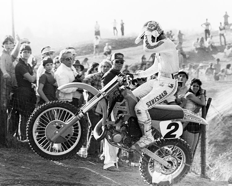 Wardy at Gainesville in ’85 on the works Kawasaki KX250. Not sure what he’s doing with his hand. |