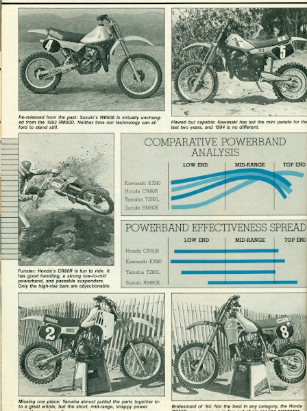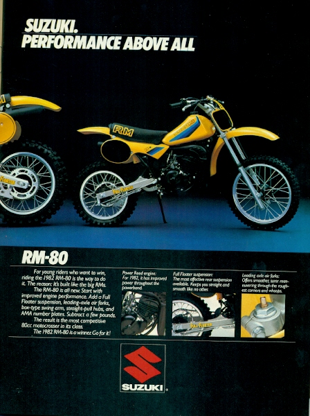 My first bike that I can really remember having is an Indian 50 but my magazines don’t go that far back and there wasn’t many shoot-outs in the 50cc Automatic category. Then I had an 82 RM 50 but I couldn’t find that either, besides I was barely able to ride them so any sort of memory of them revolves around me turning the throttle and being sacred shitless. So let’s start with a 1982 RM80 that I rode in ’82 and ’83. I remember that this is why I started liking Mark Barnett back in the day. This bike was pretty good for its time and did well in the shootouts but its competitors had radiators on the handlebars so there wasn’t much Suzuki had to do to make a good bike. This was the first real race bike in my life and I remember thinking during that next year, 1983, that I wished I had water-cooling like all the cool people had because Suzuki put that on the next year. The early 80’s were good times for Suzuki, good riders, many titles and great bikes but in the short span of three years, the Hondas would be so much better, it wasn’t even funny. For a shot of me “in action” on this bike, click HERE. |