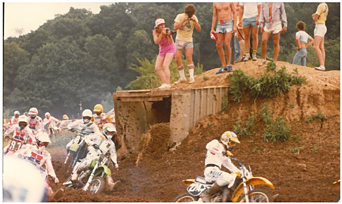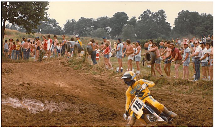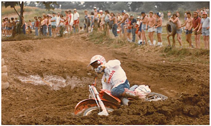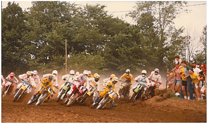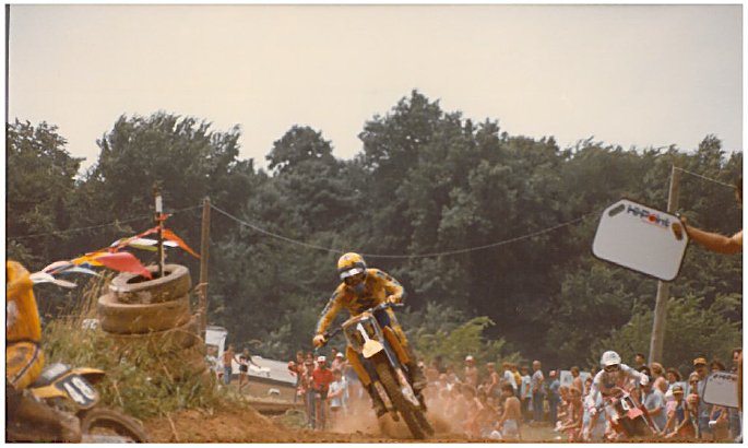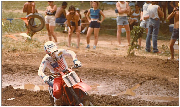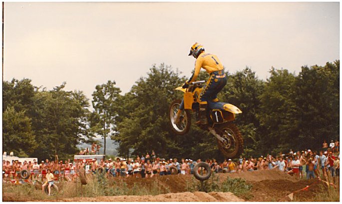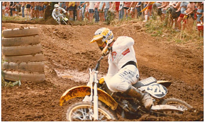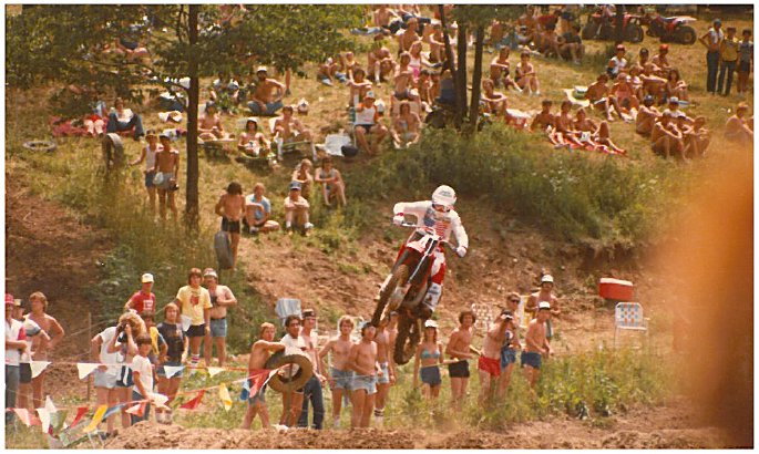 Suzuki’s George Holland was an up and coming fast kid and one of the first highly touted amateurs to come up. Him and Erik Kehoe would take turns coming oh so close to winning a championship for Suzuki. Once Holland escaped, errr I mean moved on to Honda would he finally win the 1988 125 national title. Lot’s of dudes with no shirts on at Red Bud in 1983. |