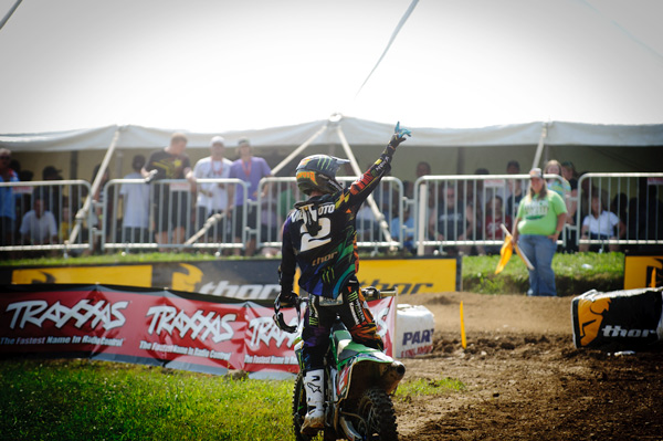 As the laps wound down to three to go I was convinced, this moto win was going to go to the guy who didn’t go down. I expected both Ryan’s to push as hard as was necessary to bring it home. Screw comfort level, screw the edge, this moto was going to the guy who rode over the edge and flipped it off as they motored by. Dungey over jumped the big table before the finish, an indication of his urgency and RV sniffed that and responded as well actually drawing closer. I got nervous as I watched them devour the lapper’s preceding the finish but as it turns out, it came down to RV simply being more aggressive and shooting past the Dunge on the OUTSIDE!! If there was ever any question as to how bad Villopoto wants this title, there’s your answer. RV’s exuberance following that first moto win was awesome to see. He looked as though he had just sealed the title with that pass and moto victory.