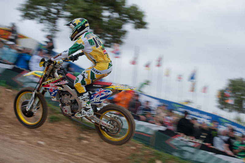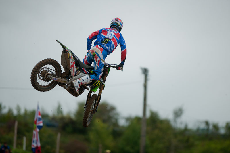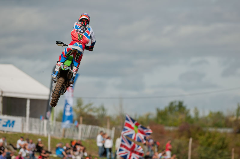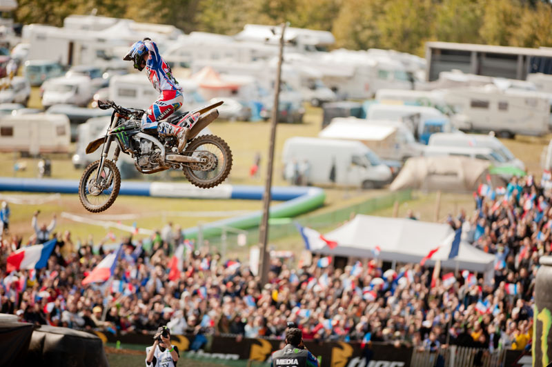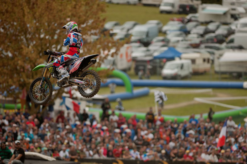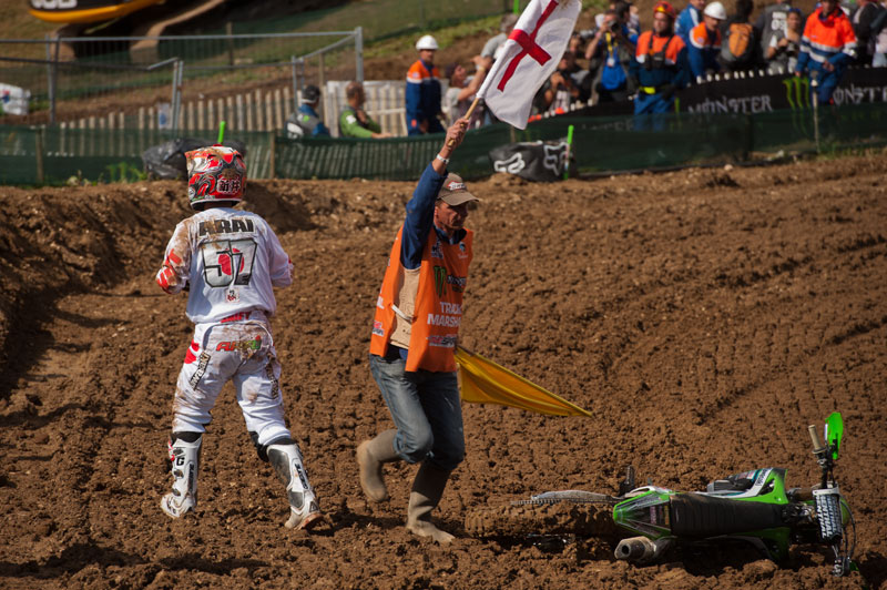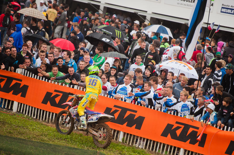I don’t know what Dean Wilson is doing here, I’m thinking it’s got to be the parade lap. Dean rode the best he could with a sore wrist but it was obvious that he wasn’t on his game in France. After the race, he had a cast on and he may be out for a while. 250 East series anyone? Between USA, England and South Africa, I’m surprised if Thor didn’t run out of red, white and blue fabric for their riders. |