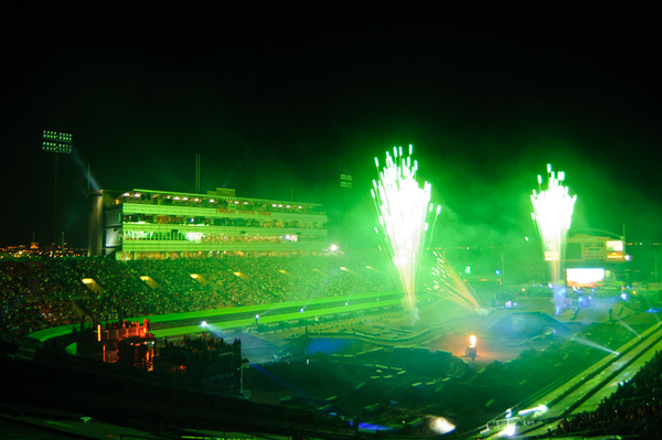 Opening Ceremonies–Looked like the timing was off between riders coming out. Kevin Windham killed it as usual, throwing a big whip off the freestyle ramp than a transfer from a berm to the steep takeoff of the double tabletop. Villopoto looked a little spooked when he arose up out of the podium on a 50 ft. pedestal contraption.