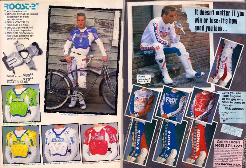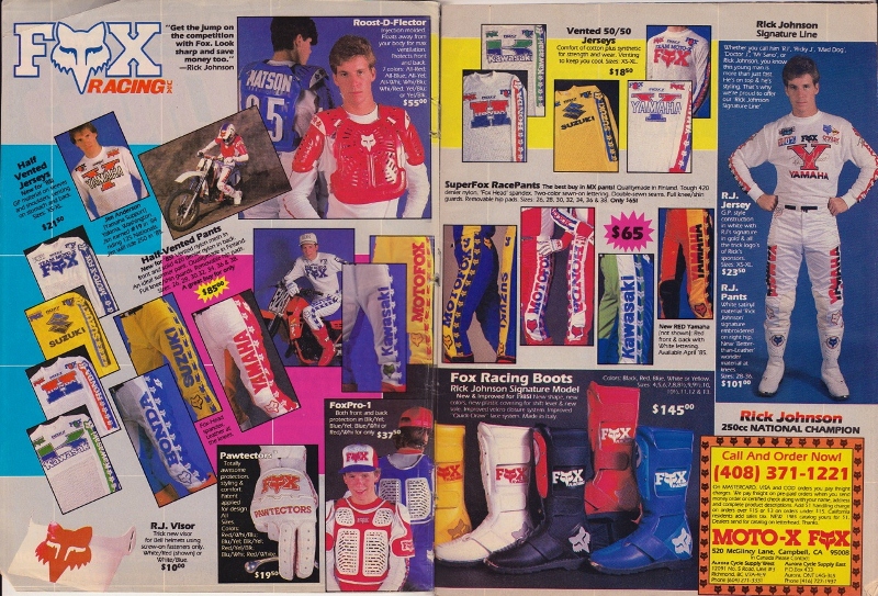 Tony- In 1986 a perfect storm hit motocross and its name was Rick Johnson. In the 1985 off-season, RJ moved from Team Yamaha to Team Honda and became the dominant man in Motocross. RJ had always been a stylish rider, but in 86 he and Fox took that to a whole new level. When I saw this red white and blue signature gear, I thought it was the coolest stuff ever. These designs by Fox were so well done they still look great today. With iconic products like the Roost-2 chest protector and Comp-2 Boot, Fox was poised to take the #1 spot from JT Racing. If you want to look at the incredible difference a year makes, look at this Fox RJ ad from 1985. The 86 RJ is the “King of Cool” with all the right moves. The 85 RJ looks like a dork that does not even want to be in the ad. The products look dull and boring to boot. In 1986, Fox and RJ took a quantum leap forward that would propel them both to the top of the sport for years to come.