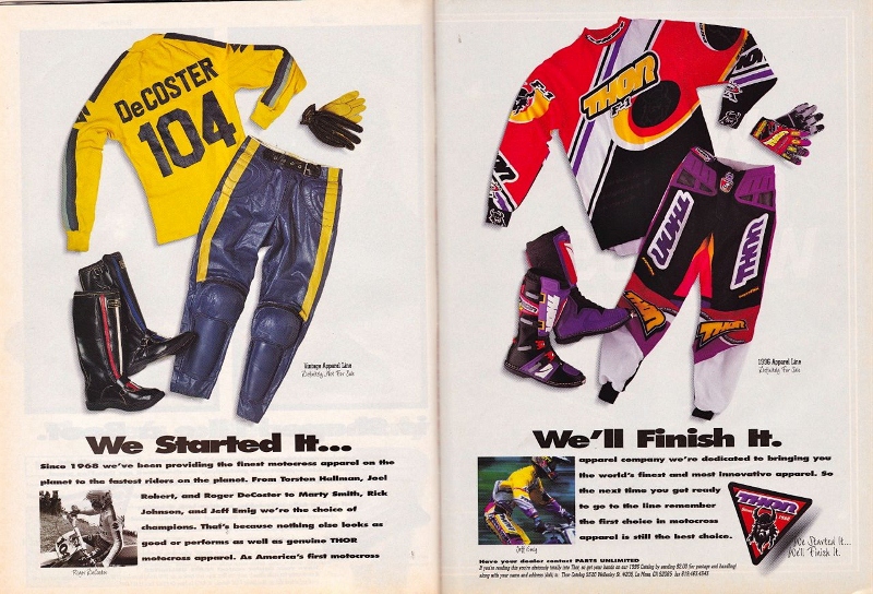 Tony- For me this is when Thor really started to hit its stride. Thor had started in the 70’s as Torsten Hallman Original Racewear with decent success. But by the mid 80’s, they were struggling with their identity. They had guys like 125 Champ George Holland riding in their stuff but the product was not a real threat to powerhouses like Fox and JT. In the early 90’s they started to turn the tide with young up and comers like Jeff Emig. By 1995, they were really putting on a push to challenge then market leaders, like Fox and AXO. This ad is cool to me because it touches on Thor’s heritage while also stating in no uncertain terms that they are serious about competing with the best going forward. Within a few years of this ad Thor was indeed one of the top gear companies in motocross.