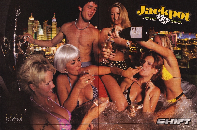 Matthes- Shift had it going on for a while and then they didn’t. These ads are cool and the bottom one hits home with me because for some strange reason, I was standing ten feet off to the side when they were shooting this. My buddy Jason Frenette and I had gone to MGM Hotel the night after Fro clinched the title, saw Brian Swink in the lobby and he got us up to this suite with Fro and all his buddies celebrating his win. This was out on the balcony and they really didn’t take too many takes before everyone got out. All the chicks are wives or girlfriends of riders and in case you didn’t notice, Fro is wasted. Even though Reed has brought their name back to the forefront, I think my favorite Shift stuff was the Factory Connection stuff in the Billy Laninovich days.