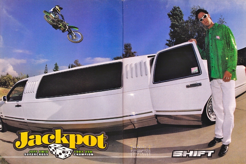 Tony- I could probably list half a dozen Shift ads from this era as some of the best gear ads of all time. These two were made by Shift to celebrate Jeff Emig’s 1997 Supercross title. Shift actually had to make two different ads because magazines like MXA would not run the hot tub version. The thing that made all of these ads so great was how well they captured the whole rock star vibe. They perfectly utilized the images of guys like Jeff Emig and Seth Enslow to establish instant brand credibility. Shift did not take itself too seriously either, putting out products like leisure suits and gold necklaces. Simply put, Shift in this era was the height of cool and its ads did a fantastic job conveying that image to the consumer.