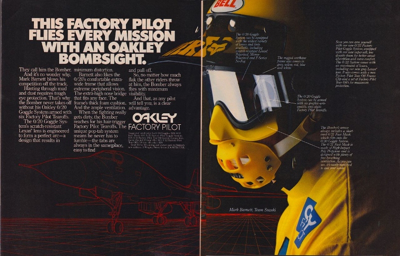 Tony- These days, Oakley is an international powerhouse selling everything from sneakers to wristwatches. It was not always that way however. In the early 80’s Oakley was core Moto and they sponsored some of the biggest starts in the sport. Mark Barnett, Johnnie O’Mara and Jeff Ward were all Oakley sponsored riders. In 1983, Oakley came out with one of the coolest Moto ad campaigns of all time to promote their riders and the “Oakley Factory Pilot” was born. These ads made direct comparisons to motocross riders and jet fighter pilots. To me, these ads were so great they do not look a bit dated almost thirty years after they were created. They have stood the test of time and stand out as some of the greatest motocross ads ever.