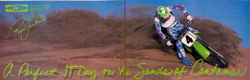 Tony- This JT ad is a real classic from the 80’s. I don’t believe Ron Lechien ever took a bad picture on a motorcycle and this ad really captured his perfect style on a bike. This Bad Bones gear was super cool at the time and Ronnie always looked great in it. This ad did a great job of doing much more than just promoting JT gear. It evoked the free spirited lifestyle that all of us who ride identify with. The desire to just get on your bike, forget the rest of the world and just shred. Many companies have copied this ad since, but this JT ad was the first and I think the best.