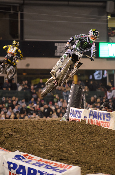 Splitting the cost to race with his team, Zach showed up at Anaheim this past weekend ready to reestablish himself as a supercross threat. At first, many mistook him for the other #338 (J-Law) and the people that did remember him didn’t think he had the speed to run anywhere near the top five. Even though his team doesn’t have much experience with supercross and Zach hasn’t raced indoors since 2008, he surprised everyone by qualifying third overall and getting a solid fourth in his heat race. His main event didn’t go so well due to the starting gate debacle but he was still able to get a very respectable ninth place finish. Overall he was exciting, aggressive, and fast. His bike looked good all day long and by jumping into the class and being competitive right away, he was able to remind everyone that Zach Osborne still has some supercross skills.