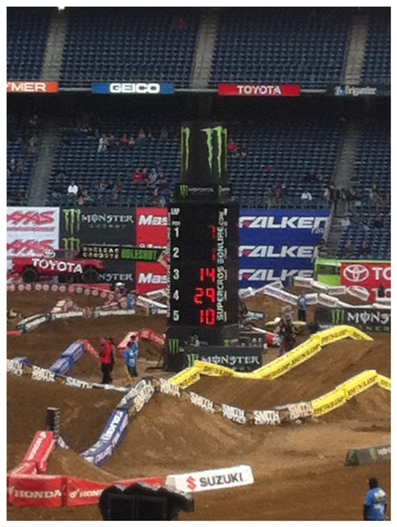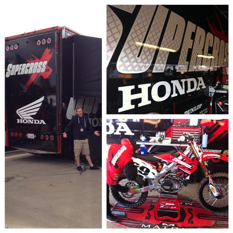 We meet up with Mr. Matthes and practice was already underway so we headed up to the press box to stake our claim on some seats. Thank you to both Jacki Short and Mr. Jason “Weege” Weigandt for the tickets-the lady at the will call counter was confused that I had two tickets waiting for me. Weege and Hansel (he’s so hot right now) with RacerX were already in position in the press box watching practice, tweeting the play by play and taking notes. Something I had never put much thought into before but that I quickly learned was the amount of people and work that is required to provide the type of content available on a website like RacerX it’s pretty impressive to see it all in person (feel free to insert a joke about me swinging for the balls of RacerX). After watching about 29 seconds of practice it was blatantly apparent that the whoop section that was laid out directly in front of us was going to be the, great divide, achilles heel, and/or equalizer, of the evening. This was the 1st practice aka the un-timed practice, so some don’t consider it the 1st practice but anywhoo when the unseeded guys hit the track the carnage started and I took that as my que to leave. I headed to, take a wild guess, the…….Supercross.com truck to try and touch Shorty and say hi.
