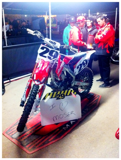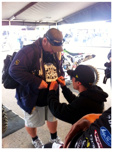 So anyways, Mrs. Moser dropped me off at the airport I thanked her repeatedly then kissed her goodbye and headed straight to the bar nearest my terminal, I was anxious and needed to calm my nerves. After a tall OJ I was feeling more relaxed and excited about how the rest of the day was going to unfold, the flight was uneventful and the soothing voice of a Matthes podcast even put me to sleep for a Short while. The detailed itinerary provided by Mrs. Moser (she is a big organizer/planner) said I was to meet Pookie at the airport upon my arrival in San Diego. To my surprise not only was Pookie waiting for me she had written out a “Moser” sign. We hopped in a cab and headed straight to Qualcomm stadium, traffic was backed up a good distance from the entry so we walked a ways to the stadium. In an attempt to find the correct ticket counter we walked ¾ of the way around the stadium, Pookie and I getting lost became a reoccurring theme of the trip and we came to the conclusion that neither of us has any sense of direction. Motocross celebrity sightings started happening immediately and I’m not ashamed to admit I couldn’t hide the smile on my face, it’s just cool to see all the riders and industry guys you watch on TV and online and read about in the magazines wandering around the pits.