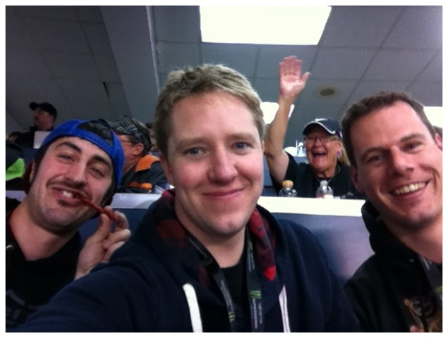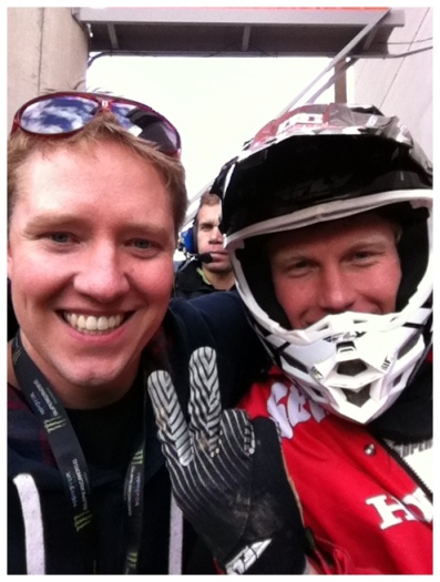 I’ve busted Shorty’s balls on Twitter so to speak about an interview he did on DMXS where he said he likes “creamy peanut butter with a little bit of sea salt” and he has since taken a liking to Justins creamy nuts. Shorty bought me a jar to try and I was very eager to walk around telling everyone I had Shorty’s creamy nuts in my hands. Ryan and Hannah Morais had came down to watch the race it was nice to meet them and I was very impressed with how well Ryan was getting around as having your mouth wired shut doesn’t look very comfortable. I had a long and lovely talk with the man in charge of keeping clothes on Shorty, Max with Fly racing he is a good guy in the sport and it was great to catch up with him. Shorty filmed a bit for the video he posts on www.andrewshort.com and time will tell if asking me about morning wood hits the cutting room floor or not. I was still freezing and I figured if Swizzle has the balls to ask Timmy Ferry if he can borrow a belt it wasn’t out of line for me to ask Shorty if I could borrow his pants while he was racing, to bad Shorty and his six pack fit into a size 32” waist and I’m a 34” I also wasn’t wearing underwear so I didn’t slip my Shorty into Shorty’s pants.