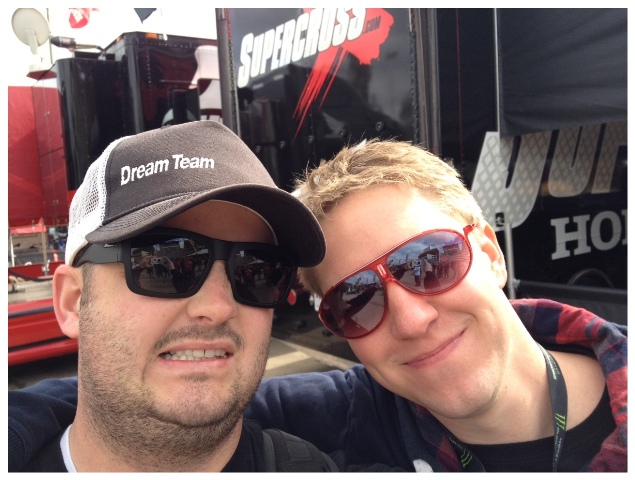 THE @Titslegendary had also made the trip to the Whales Vagina so it was time for us to embrace for the first time. Pete the Producer and I have been friends on Twitter for a couple years now and I consider him a friend. But in all honesty our relationship up to this point could be likened to that of having a cyber boyfriend or girlfriend, sure you think you know someone pretty well and you’ve send a few racy picture texts back and forth but shit gets real when you have the pleasure of touching that person for the first time. Pete and I embraced next to the Supercross.com pits and it was a magical moment. The full embrace lasted longer than most, it was nice, he had strong musk about him and we both commented that the other was taller than we expected (Matthes Note: This is ridiculous. Is it a race report or a Harlequin romance novel?). I’d liken the interaction to seeing an old friend you haven’t seen for a long time and our conversation picked up right where we had left off during our last cyber chat. Pete headed to the KTM tent to reconcile with Dungey and I turned my attention to trying to catch a peek of Shorty with his shirt off.