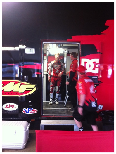 You know that moment in the movies when the two lead characters eyes meet for the first time, well that’s the best way to describe how Shorty and I made eye contact in the whales vagina, I caught his eye and he flashed me that patented Shorty smile. Next thing I know Shorty is slapping my ass then introducing me to all the guys on the team, no big deal just Larry Brooks (strong hands), Jeremy McGrath (King of Supercross), Mark Valcore (the man that tightens Shorty’s nuts) and four or five other guys that all have specific job and whom I can’t recall their names. Let me tell you, all the guys couldn’t have been nicer or more welcoming throughout the day. In an attempt to break the ice when I shook McGrath’s hand I said he looked familiar and asked what his name way (McGrath was my idol growing up, his poster was on my bedroom wall) McGrath responded with “What are you Shorty’s brother or something?”. A little later one of the team members and I were making small talk and he said “So your Shorty’s brother?” I should have ran with it and I’m still kicking myself for not playing along. Shorty was getting ready for second practice watching some videos and talking about line choice. I gave my ten cents on the fast line through the whoops then helped Shorty get geared up for second practice (not really I tried to stay the hell out of the way and tried not say anything too stupid it was still early I had plenty of time to make an ass of myself later).