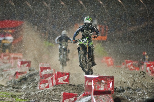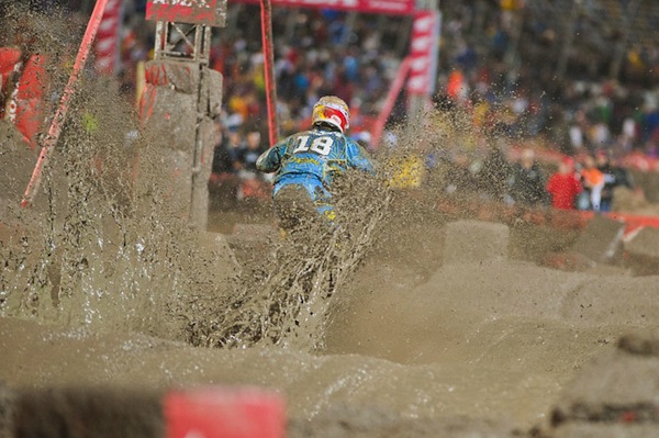 Enter Mother Nature and another intriguing week of racing, this time dictated by unpredictable weather and the man’s-track of the Supercross series. There are tracks with bigger obstacles and more technical sections but it’s the lap times and deep terra-firma that make this track Chuck Norris’ favorite.
