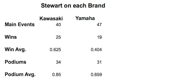 The great debate. Does Stewart’s problems stem from the unorthodox Yamaha or do they come from something else? Well, the results here show that his win avg. as well as his podium avg. has exponentially declined since he hopped on the Yamaha. Moreover, the sample size from each bike (40 to 47) are pretty close so the findings are all pretty telling.