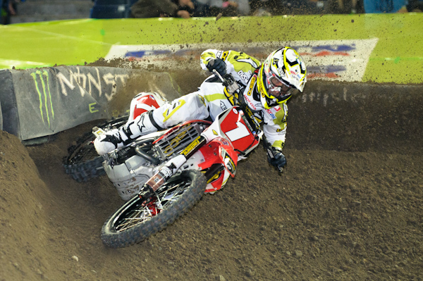 The typical Toronto dirt is known for being a different beast. This year it was a hybrid of what the riders are used to (rocks and ruts) but with the added sketch-factor of dry and slippery. You see, the weather in the great white north is usually much colder when the series crosses the border, so when they truck the dirt into the Rogers Centre, it begins to thaw and during that thaw process, it is spongy and ruts up fast and deep. This year however, temperatures have been record breaking and the dirt thawed before being trucked. So, while the dirt wasn’t spongy, it still had the rocks and ruts to compound the dry and slippery characteristics, which gave the riders reason to be cautious all night.