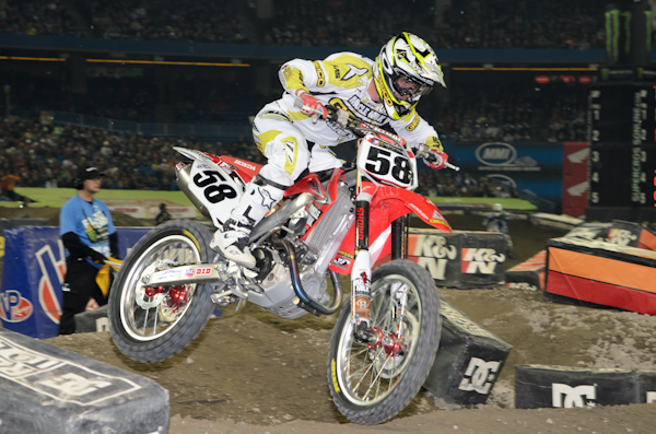 I don’t see how you give the rock hard ride hard award for the night to anyone other than Justin Bogle in Toronto. Justin’s night began on a high with him posting the top qualifying time but that’s where his love affair with Toronto ended. In his heat he got caught up in a corner and ass-packed by Filthy-Phil, then a few laps later when he was charging back to a qualifying position, Pellegrini takes the main line on the finish-line jump which fades inside to out and initiates contact and a nasty free-fall to the ground for both riders. Bogle was trying to make something happen by taking an alternate line and just didn’t take into account how far the main line brings the riders outside. There was no room and you saw what happened. It was a racing incident and an UGLY crash. It was a bit of divine intervention that Bogle lost his wind in the crash because it was apparent; his initial feeling was that Pellegrini made a bonehead move. Bogle dominated the LCQ but then in the main his misfortune returned as he found himself in last and battling forward again. It was a resilient ride to 8th for Justin who had to be wondering what the hell he had done to deserve that kind of misfortune all night long.