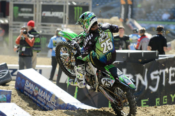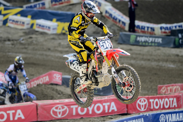 Tell me if you’ve heard this one before, it’s the parade lap and a guy practicing a start sideswipes an opponent, putting them both on the ground in a heap and in pain. How does that happen? Actually, seeing how Jason Anderson rebounded from that incident may inspire riders to devise similar tactics to spike their heart rate prior to the main event to assure they are completely ready for battle. Maybe guys will start straight-up T-boning on the parade lap? Helmet slaps? We see all kinds of antics when the riders are behind the gate, maybe it’s time to really give the fans a show, after-all, it is called the “parade” lap. Parades are supposed to be a spectacle to entertain the viewer. Wait, maybe that’s why they started calling it a “sight-lap”? Well that still works because that was a hell of a sight.