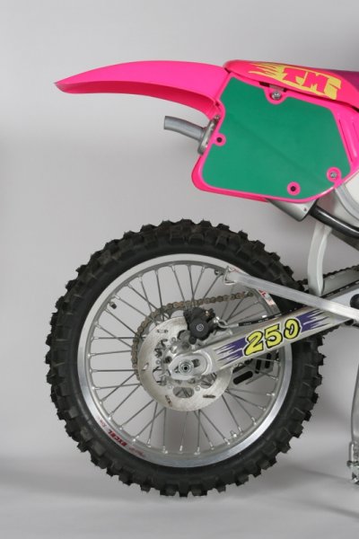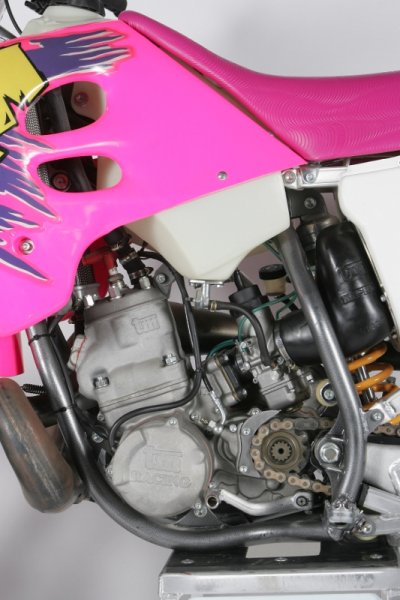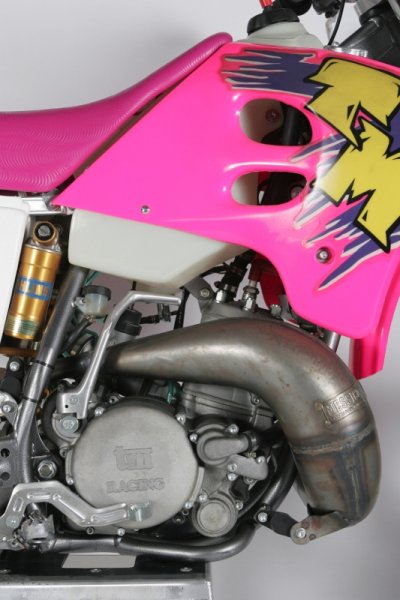 Perhaps the most curious part of the TM was the outlandish bodywork. It was certainly impossible to mistake the bike for anything else on the track with its eye-watering neon pink plastic. The plastic itself was an interesting mishmash of bodywork from other machines. Early TM’s came equipped with radiator shrouds and front fenders off of a ’93 RM combined with ’92 CR rear plastic. Later TM’s switched to using side panels and rear fenders from a ’94 KX (I actually think this looked way better on the bike). No matter which combination of bodywork you were lucky enough to get, it was always in florescent pink. Subtle the TM was not.