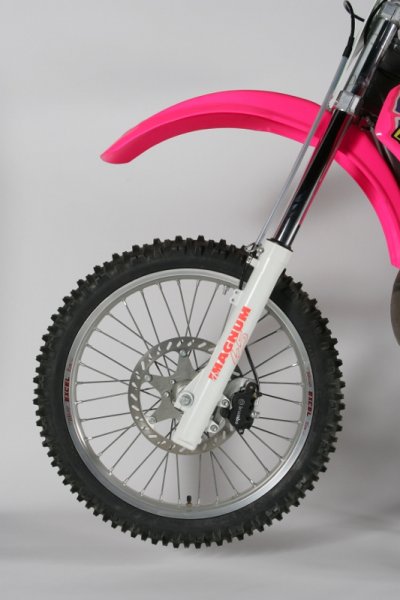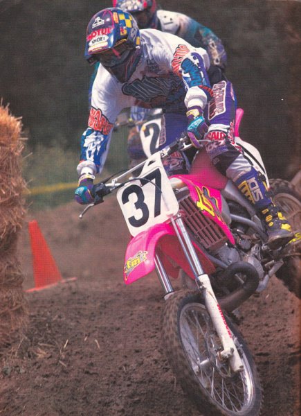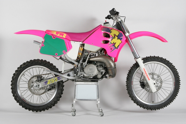 | Mid-nineties TM’s used an oddball combination of plastic components from several different bikes, all painted day-glow pink. This TM has a KX rear mated to an RM front. No matter what plastic you got, the bike was impossible to miss. Photo Credit: Motocross Action |
