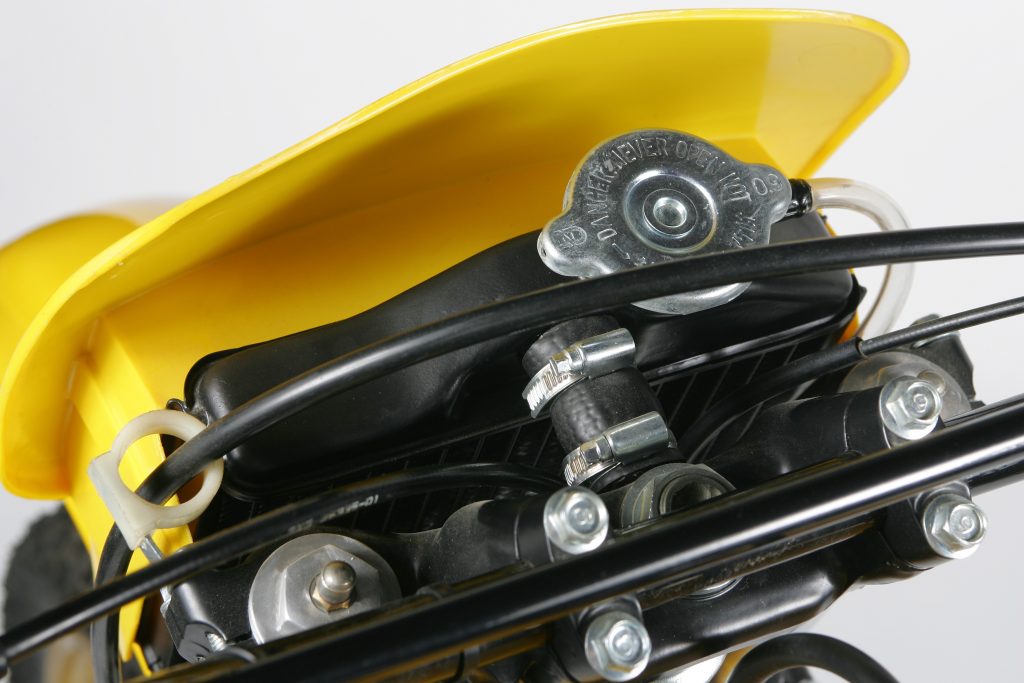 The other problem with this design was that it adversely affected the handling of the bike. The decision to place the radiator and all its hardware on the triple clamps meant that there was a lot of weight very high-up on the chassis. This made the steering of the bike feel sluggish and added to a very top-heavy feel that no one liked. The system was so poorly designed that Yamaha’s factory team in ’82 actually went back to air-cooled motors on their race bikes.