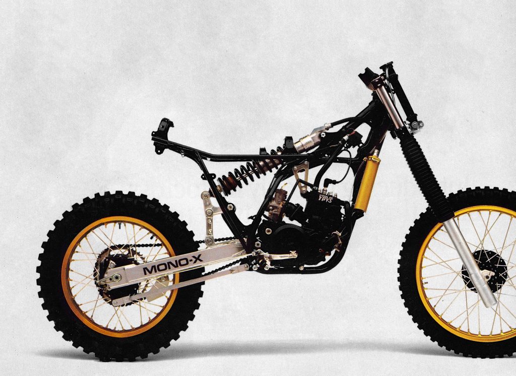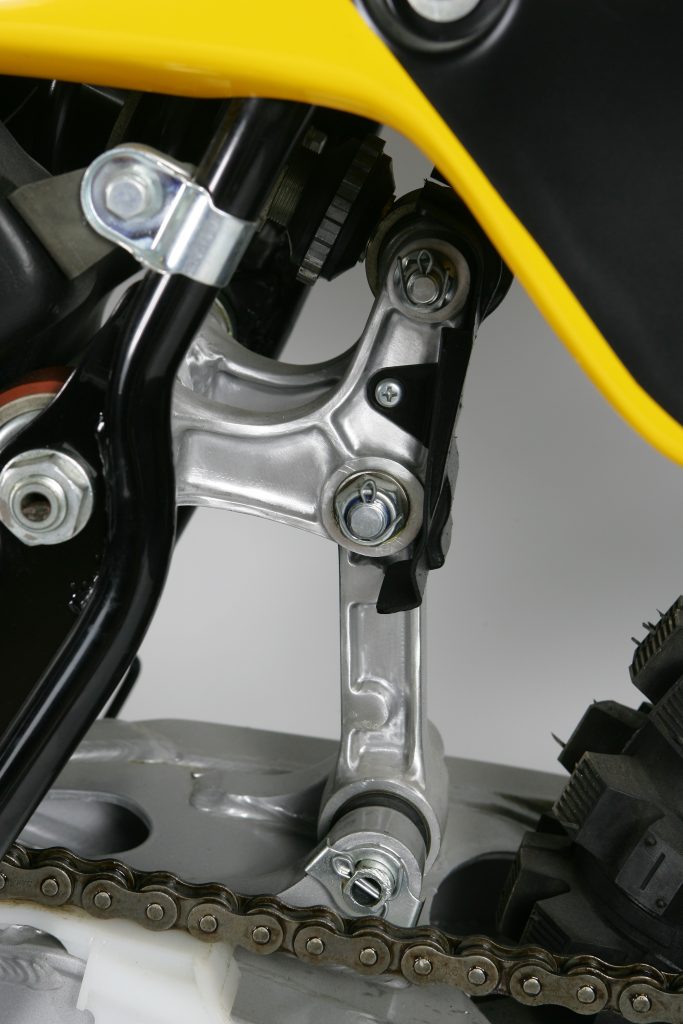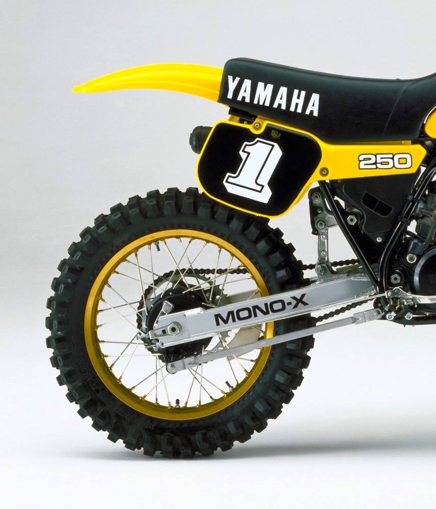 Here is a good look at the ’82 YZ’s new Mono-X rear linkage. The new rear end retained the previous design’s shock location, but now it attached to a rising-rate set of linkage arms. The ‘82 design suffered from a high center of gravity and mediocre performance. For ’83 Yamaha would ditch this design altogether and go with a setup much closer to what we use today. Photo Credit: Stephan LeGrand