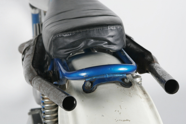 | The twin pipe design was a throwback to Suzuki’s road race heritage. The upswept design made for excellent ground clearance, but the dual pipes made the bike very wide in the middle and prone to burning the rider’s leg. Photo Credit: Stephan LeGrand |