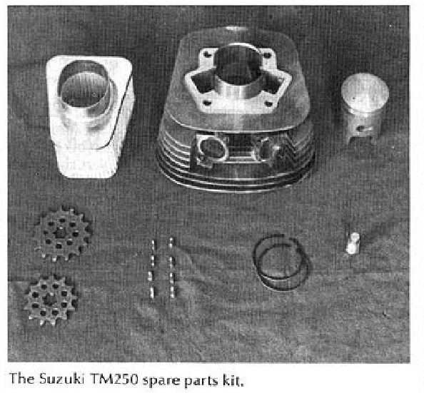 | Every TM250 came with a complete parts kit that included a cylinder, pistons, rings, air cleaner, replacement clutch parts, gearing, and carburetor jetting. |