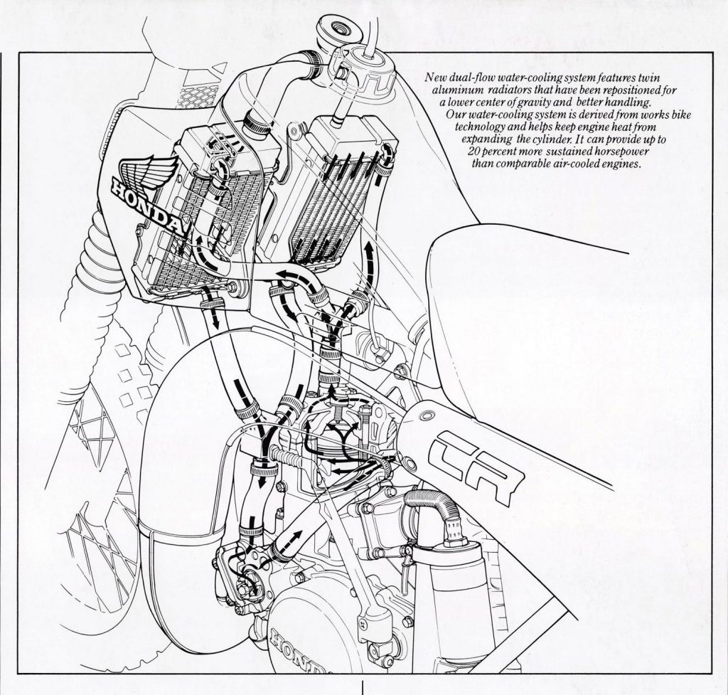 The one thing that worked as promised was the liquid cooling. Honda used a much simpler approach to their cooling system than Yamaha had done with their new liquid-cooled YZ125. Unlike the YZ, which mounted the radiator on the steering head and piped coolant through the frame, the CR mounted its dual radiators at the front of the gas tank and piped the hoses directly to the engine. The radiators were still mounted fairly high on the bike but the Honda design was far less complicated and less prone to leaks. As long as you checked the coolant level regularly, it was pretty trouble free.