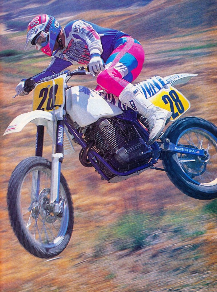 The ATK’s 562cc Rotax air-cooled mill was hardly state of the art even in 1989. With manufacturers like KTM and Husky already producing liquid-cooled DOHC racing singles, the Rotax mill looked downright old-fashioned by comparison. What the motor lacked in curb appeal, however, it made up for in rugged reliability and blistering performance. The 604 produced a thundering staccato of four-stroke torque from the second the throttle was cracked until the rev limiter kicked in. The motor had ground-shaking power and was fast enough to show even CR500R riders its tail lights. There was a bit of a learning curve for riders raised on two-strokes, however. The motor revved slower than a two-stroke and the power was more Massey Ferguson than twin-turbo Porsche. There was also A LOT of engine braking under deceleration. Today’s four-strokes have virtually none of this old-school trait, but rolling off the throttle on an ATK was like throwing out an anchor. On the plus side, the reward for learning to manage the ATK’s quirks was holeshots by the dozen.